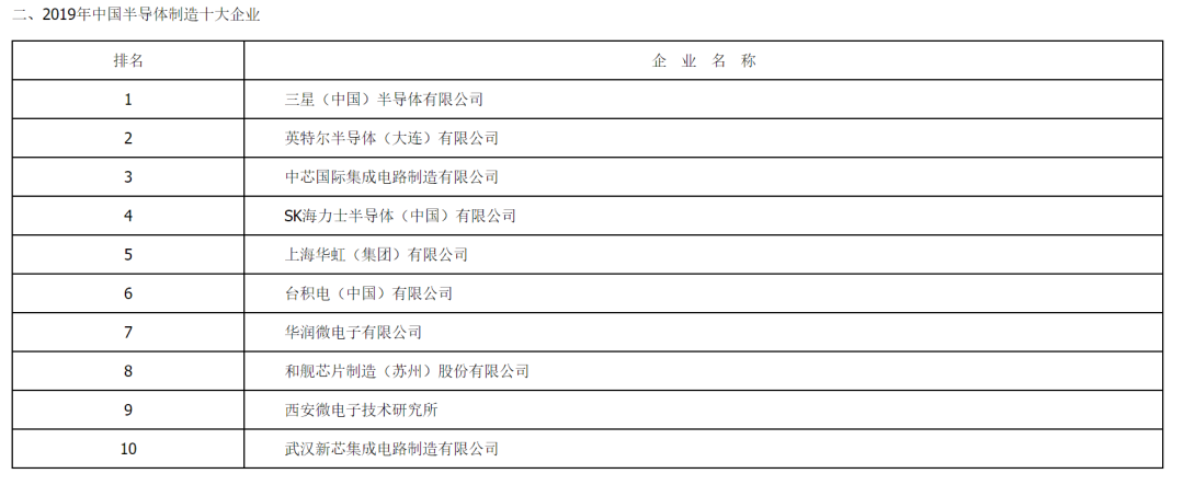 下图来自中国半导体行业协会,2019年中国前十大半导体制造厂,有五家是外资,其中前两名是三星(西安)和英特尔大连厂,规模都比中芯国际要大。