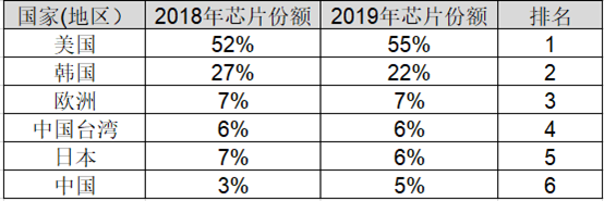 在芯片份额方面,韩国由于在存储器方面的极高全球份额,因此总份额上位于全球第二。