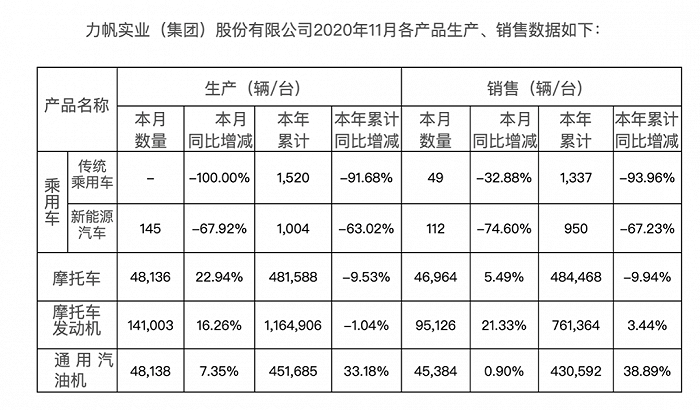 今年11月,力帆传统乘用车产量归零;销量为49辆,同比下滑32.88%。同期,新能源车产量仅为145辆,同比下滑67.92%;销量为112辆,同比下滑74.6%。