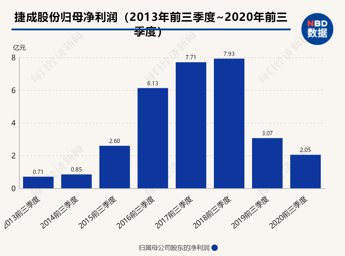 同时,该股业绩也出现下滑势头,捷成股份于2020年10月30日披露三季报,公司2020年前三季度实现营业总收入19.6亿,同比下降25.6%,降幅较去年同期扩大;实现归母净利润2亿,同比下降33.3%,降幅较去年同期收窄;每股收益为0.08元。报告期内,公司毛利率为31.1%,同比提高4.0个百分点,净利率为10.4%,同比降低1.2个百分点。