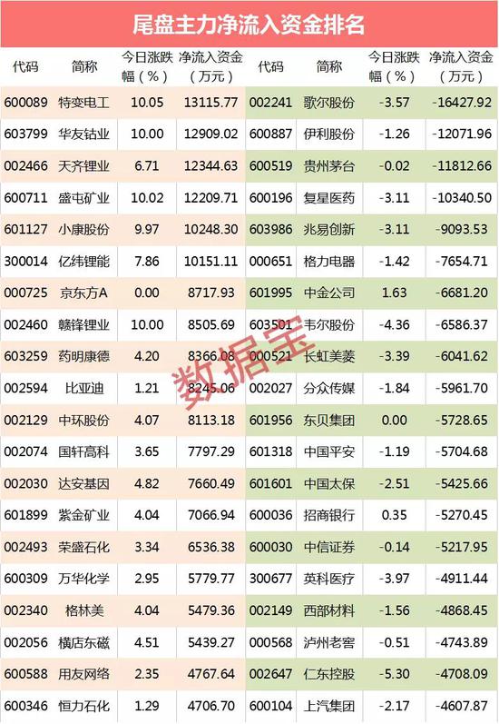 尾盘资金追捧新能源车或锂电相关概念股,华友钴业、天齐锂业、盛屯矿业等5股资金流入超亿元。
