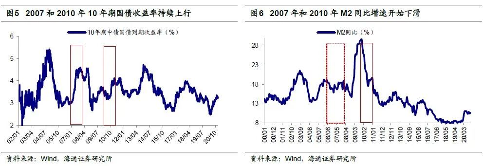 像07、10年:宏观流动性收紧,企业盈利加速回升。回顾2007年,当时宏观流动性收紧,10年期国债收益率从07年初的3.02%升至07年末的4.43%,上行了140个BP,M2同比呈现双顶格局,分别在06/07达高点18.4%、在07/07达高点18.5%,此后开始下滑。虽然2007年宏观流动性开始收紧,但是企业微观盈利持续改善,06、07年A股归母净利累计同比保持高增长,分别为48.4%、45.4%,ROE从06Q1的7.3%升至07Q4的16.4%。回顾2010年,当时宏观流动性也开始收紧,10年期国债收益率从10年初的3.66%升至10年末的3.88%,上行了22个BP,M2同比从26.0%降至19.7%。虽然2010年宏观流动性开始收紧,但是企业盈利仍在加速回升,A股归母净利累计同比从09年的25.2%升至10Q1的62.2%,此后净利润增速仍维持高位震荡,10年全年达到40.9%,ROE从09Q2的10.3%升至10Q3的15.4%。这次类似07、10年,即宏观流动性收紧,企业盈利仍加速回升。今年10年期国债到期收益率从4月低点2.55%升至当前的3.23%,M2同比从4月的11.1%降至11月的10.7%,未来随着疫情逐步得到控制,宏观经济开始复苏,我们认为2021年流动性边际收紧趋势不变。前文我们提到这次A股盈利从20Q1开始见底后回升,展望2021年,我们认为A股净利累计同比增速将在2021前三季度保持高位,全年达到15%,A股ROE将持续回升至2021年底,全年达9%。