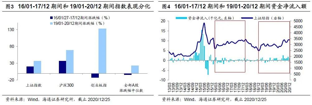市场背景不像:16-17年是结构市,19-20年是牛市。之前我们写过专题报告分析过,股市状态分为牛市、熊市、震荡市(结构市),分别类似夏天、冬天、春秋天。16-17年是类似春秋天的结构市,但19年以来是类似夏天的牛市,牛市三个特征全出现:指数普遍上涨、大多数个股涨、场外资金入市,而16-17年期间一个都没有。从主要指数涨幅看,16/01/27-17/12期间上证指数区间涨跌幅为20%,沪深300为37%,创业板指为-12%,而19/01-20/12期间上证指数区间涨幅为36 %,沪深300为69%,创业板指为132%。从个股涨幅看,16/01/27-17/12期间A股(不考虑新股)共计2772只,其中1443只上涨,占比为52%,期间全部A股涨跌幅中位数为-3.9%。19/01-20/12期间A股(不考虑新股)共计3542只,其中2474只上涨,占比为70%,期间全部A股涨幅中位数为23%。从场外资金看,A股资金流入项包括银行转账、融资余额增加、公募+ETF基金发行、私募证券基金、基金专户、银行理财、券商资管、信托、保险类和外资,资金流出项目包括IPO、产业资本减持、各项税费等,按照以上明细项目统计,16/01-17/12期间A股市场累计增量资金为-1946亿元,而19/01-20/12期间为2.4万亿元。