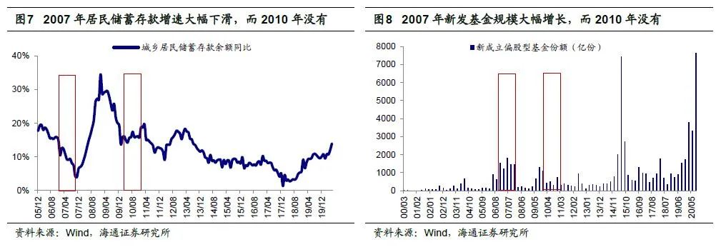 更似迷你版07年:牛市氛围,居民资金入市。前文我们从宏观流动性和基本面来分析目前A股所处的背景与07、10年类似,在此我们进一步从微观流动性来分析,我们认为这次更似迷你版07年。2007年A股当时正处在牛市第三阶段,05/06-06/12期间上证指数涨幅达164%,沪深300达到150%,A股显示出了巨大的赚钱效应,市场沉浸在牛市氛围中,这吸引了增量资金加速入市,具体表现为居民存款搬家和新发天量基金。05-06年期间我国城乡居民储蓄存款同比增速保持在17%左右,进入2007年开始大幅下滑,07/01降至10.5%,07/11进一步降至低点4.0%,2007年居民储蓄搬家进入股市。同时,2007年大量公募基金开始发行,全年累计发行偏股型基金共计5941亿,而2005-06年仅为3579亿,这为市场带来大量增量资金。反观2010年,当时并未出现明显的存款搬家迹象,全年我国城乡居民储蓄存款同比增速保持16%左右,而且公募基金发行规模不大,全年累计发行偏股型基金共计1963亿,低于2009年的3269亿。