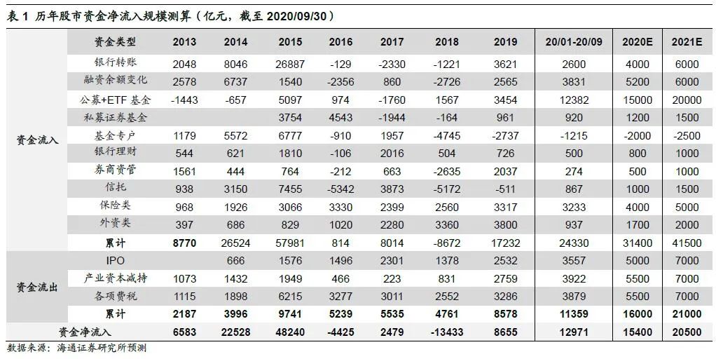 当前A股也处在牛市第三阶段,目前市场赚钱效应较好,吸引增量资金入市,典型代表就是公募基金大发行,从而我们认为2021年更类似迷你版的2007年。《增量资金望超两万亿——2021资金入市测算-20201204》中,我们测算到参考05-07年牛市经验,宏观流动性收紧后微观股市资金仍在加速入场。目前wind统计下已经通过审核但是尚未发行的股票型和混合型基金有350只,考虑到wind口径有疏漏(今年一共发了800多只基金,但是wind只有400只基金的数据,占比大概50%),箭在弦上的基金可能已经超过700只。假设每只基金平均发行份额为25亿份(今年800只新发基金对应2万亿新发份额),再假设每只基金的股票仓位为80%,则光明年一季度乃至二季度前半段入市的基金就有望超过1.4万亿。我们预计2020年全年资金净流入1.5万亿,2021年超2万亿元,具体测算数据如下表1。