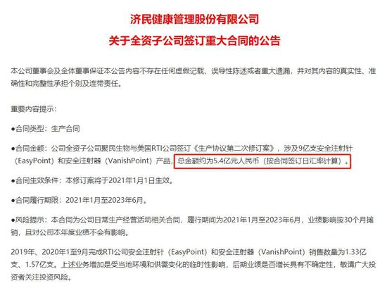 公告表示,公司全资子公司聚民生物与美国RTI公司签订《生产协议第二次修订案》,涉及9亿支安全注射针(EasyPoint)和安全注射器(VanishPoint)产品,总金额约为5.4亿元人民币,占公司2019年度经审计营业收入约70.04%。合同履行期限:2021年1月至2023年6月。