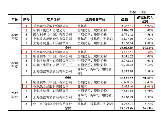 据此前招股书显示,2016年—2019年前三季度,熊猫乳品前五名客户营收总额分别为1.46亿、1.94亿、1.86亿及1.11亿,占总收入比重分别为35.64%、36.29%、30.98%及27.08%。