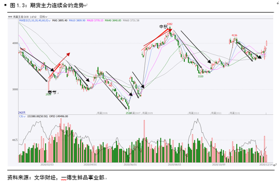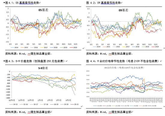 2020年在高存栏导致的现货弱势的主逻辑下,盘面以下跌为主要走势。其中有三次反弹,第一次是春节后,在春节期间疫情恐慌情绪持续爆发,导致开盘大幅下跌,随后行情逐步修复。第二次是在4月,在现货上涨的带动下,期货相对现货出现超预期的上涨,在现货价格无法支持盘面的涨幅后,盘面再次走弱。第三次为中秋前7-8月,在现货强势上涨下,09基差随之修复,在原有价格下上涨了700点,但现货的再次走弱表明高存栏压力仍压制现货价格,盘面出现修复性下跌。除2005,2009外,其他主力合约基本毫无意外的在临近交割月前出现趋势性下跌。