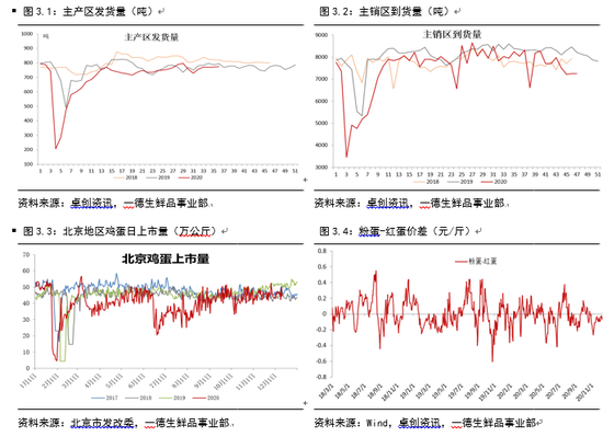近两年粉蛋养殖的增加使得市场红粉蛋比例发生变化,目前粉蛋为鸡蛋供应主流,电商平台直售渠道以粉蛋中小码蛋为主流,拉动红粉价差的回归,且电商促销也有一定的季节性,往往伴随着双十一、双十二、618等电商节日,尤其2020年双十二前的拉动作用尤为明显。未来对于鸡蛋需求的判断将需要在传统消费季节性的基础上考虑线上平台的影响。