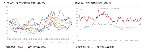 鸡蛋生产成本主要由鸡苗、产蛋前的育成期及产蛋期的饲料费用构成,其中饲料成本占比较大。玉米、豆粕作为蛋鸡饲料主要构成,价格变化对养殖成本影响较大。我们以蛋鸡饲料玉米占比62%,豆粕占比22%,料蛋比2.3计算。玉米价格每上涨1000元/吨,每斤鸡蛋养殖成本上涨0.7元/斤,豆粕价格每上涨1000元/吨,每斤鸡蛋养殖成本上涨0.25元/斤。2020年玉米现货价格由年初的1950涨至2550,豆粕价格维持在3000上下波动,年内每斤鸡蛋所需饲料成本由2.6元/斤涨至3.1元/斤。2020年全年养殖利润(仅考虑饲料成本)为0.28元/斤,考虑到人工水电等成本,养殖户全年基本处于亏损状态。2021年饲料原材料价格较难出现趋势性下跌走势,养殖饲料成本维持高位或小幅回调为主,每斤鸡蛋饲料成本维持在3元/斤左右。2020年10月后蛋价底部支撑明显,跌至饲料成本线附近即反弹,明年在成本高位影响下,蛋价底部区间抬升。