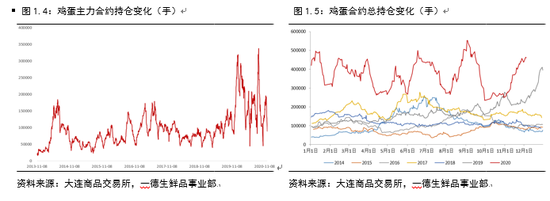 从鸡蛋持仓来看,2020年全年鸡蛋持仓维持在较高水平,年内持仓具有明显的季节性波动,持仓快速上涨基本对应着盘面价格的下跌,如4月30号持仓开始增长,主力2006合约持续下跌,创下年内期货价格低点。6月1号持仓再次增加,2007合约趋势性下跌。8月7号开始的持仓上涨创下年内持仓高点,09冲高后出现下跌趋势。最近的为11月开始的增仓,导致2101盘面表现再次走弱。从全年的持仓变化来看,基本每次大增仓都对应着盘面的下跌趋势,叠加年内现货价格的配合,使得盘面全年出现下跌为主、反弹为辅的走势。