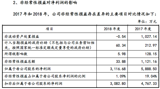 2017年,公司非经常性损益金额为1,121.16万元,其中非流动资产处置损益1,027.14万元,主要内容是公司处置参股公司广投乾丰股权所得,具有偶发性。2018年,公司非经常性损益总额33.88万元,同比上年降幅较大,当年净利润受到较大影响。