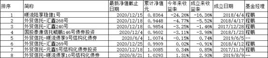 此外,外贸信托-汇鑫268号与外贸信托-汇鑫240号分别成立于2018年4月17日、2017年12月28日,截至其最新净值更新日期2020年12月18日,这2只基金的年内收益率分别为-4.77%、-3.25%,累计收益率分别为-5.52%、-1.46%,累计单位净值分别为0.9448元、0.9854元。