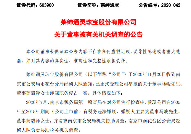 12月29日晚,公司发布莱关于董事被有关机构调查的公告称,于2020年11月20日收到南京市公安局雨花台分局经侦大队通知,已正式受理公司举报的关于董事马峻先生、董事蔄毅泽女士涉嫌职务侵占一案。