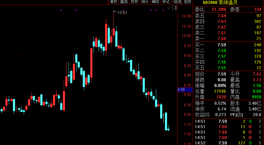 近段时间以来,莱绅通灵股价走势低迷。11月27日至12月29日的最近一个月内,公司股价从最高10.63元/股下跌至当前的7.59元/股,期间股价累计下跌24%,截至12月29日,公司总市值仅为25.84亿元。
