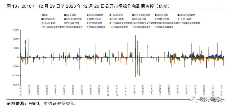 如何看待财政收支:“收多支少”吸收流动性。1月财政支出力度通常较弱,但当前财政可能有较多结余资金,2021年1月份财政支出力度有望加大。初步预计1月财政支出总额约在16500-17500亿元范围内。1月通常是是财政收入的高点。由于1月需要汇算清缴企业所得税、个人所得税以及车船税,故而是传统的税收高点。初步估计1月公共财政收入总量在26000-28000亿元左右、缴税总额在23000-25000亿元左右;由于缴税日后延至20日,预计第二周起缴税因素将开始影响银行间流动性。
