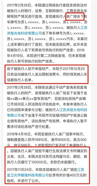 吴广旭在2017年就被列为失信执行人,被查封房产、车辆等,拒不履行判决而被拘留15天,蓝卫公司的股权也被冻结。