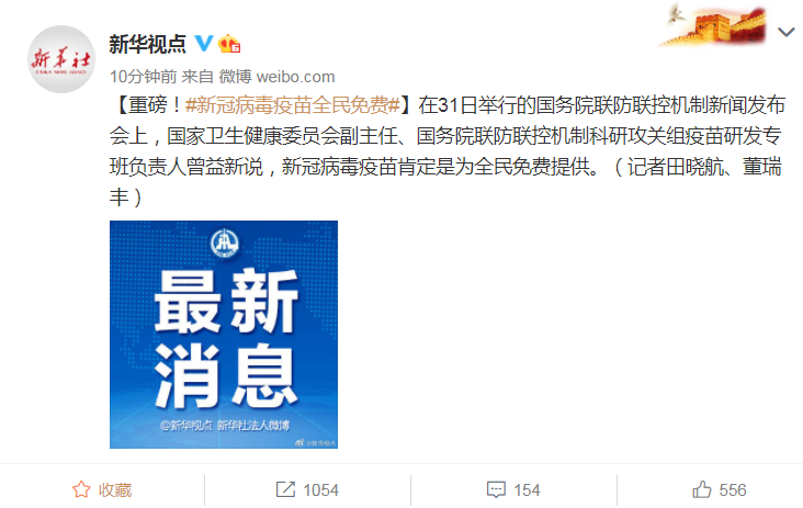中国新冠病毒疫苗上市,国家卫健委表示,新冠疫苗价格可能会根据使用规模的大小有所变化,但是一个大前提是,肯定是为全民免费提供。