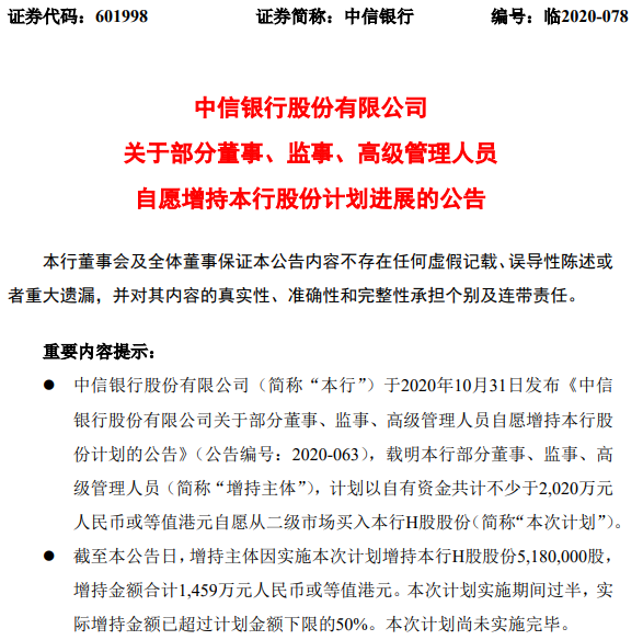 2020年12月31日,中信银行发布公告称,截至公告日,包括行长方合英在内的现任14名董事、监事、高级管理人员从二级市场自愿增持H股股份合计518万股,增持金额1459万元人民币,且本次增持尚未实施完毕。