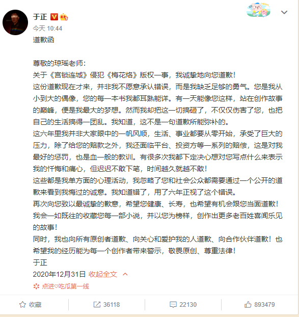但对于郭敬明、于正来说,这个道歉并不晚,甚至很及时——在未道歉的时间里,他们拍作品、做宣传、接商业活动,忙得不亦乐乎,似乎并未受到抄袭被法院公开宣判的影响,而在法律、行业、舆论于2020年年底再次形成对抄袭的合围时,道歉会为他们赢得谅解与宽容,重新拥有一个开始。