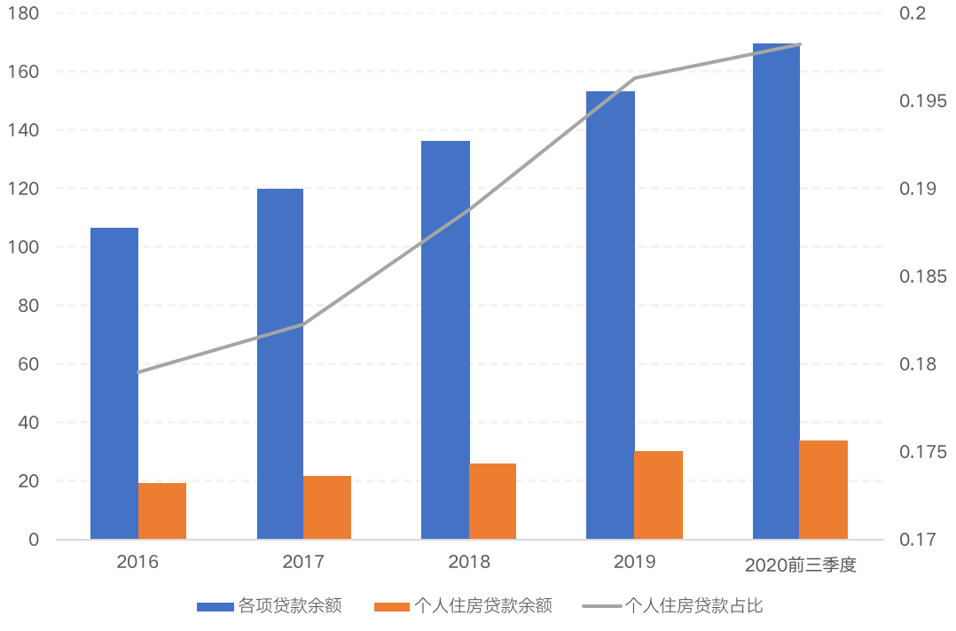 从个人住房贷款占比来看,2020年三季度末,个人住房贷款余额33.59万亿元,个人住房贷款占比约19.83%,低于“房地产贷款集中度管理要求”中“第一档:中资大型银行”、“第二档:中资中型银行”32.5%及20%占比上限。