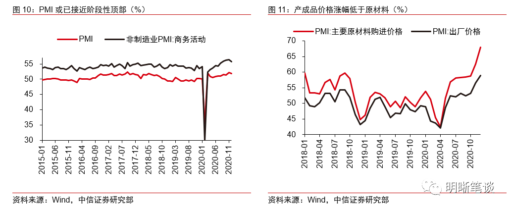 大宗原材料价格高企,部分商品库存高位,反而会对经济基本面形成利空。价格方面,PMI原材料购进价格指数提高5.4个百分点,出厂价格指数仅上行2.4个百分点,产成品价格涨幅持续弱于原材料价格,二者的差距不断扩大,将在一定程度上加重企业的成本压力。这一轮大宗工业品的价格上涨,主要在于供给端,对海外进口偏紧的预期以及市场跟风投机炒作占据主导。需求端的贡献相对有限,部分商品的库存并不低,甚至高于季节性水平。显然,原材料成本的提升和高库存对经济并非利好。