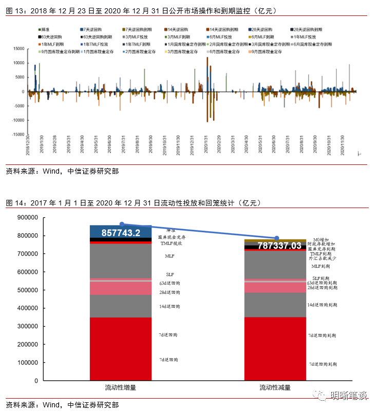 我们对市场流动性情况进行跟踪,观测2017年开年来至今流动性的“投与收”。增量方面,我们根据逆回购、SLF、MLF等央行公开市场操作、国库现金定存等规模计算总投放量;减量方面,我们根据2020年11月对比2016年12月M0累计增加13289.74亿元,外汇占款累计下降7788.46亿元、财政存款累计增加19412.53亿元,粗略估计通过居民取现、外占下降和税收流失的流动性,并考虑公开市场操作到期情况,计算每日流动性减少总量。同时,我们对公开市场操作到期情况进行监控。