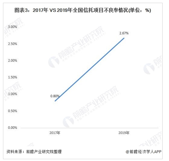 从信托项目不良率看,伴随风险资产规模的增大,信托项目不良率大幅度上升。2017年之前,信托项目不良率虽有波动,但多数时候维持在0.8%以下,2019年末则大幅上升至2.67%。