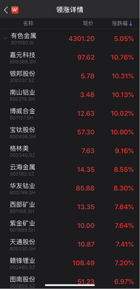 有色金属行业中,嘉元科技、银邦股份涨逾10%,南山铝业、博威合金、宝钛股份涨停。