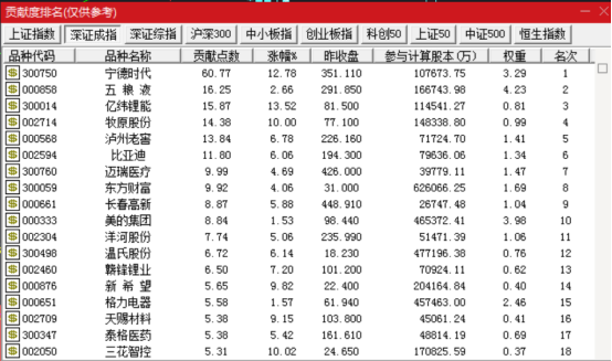 截至午间收盘,对深证成指贡献度居前的个股中,宁德时代、五粮液、泸州老窖、比亚迪、美的集团、洋河股份等创历史新高。