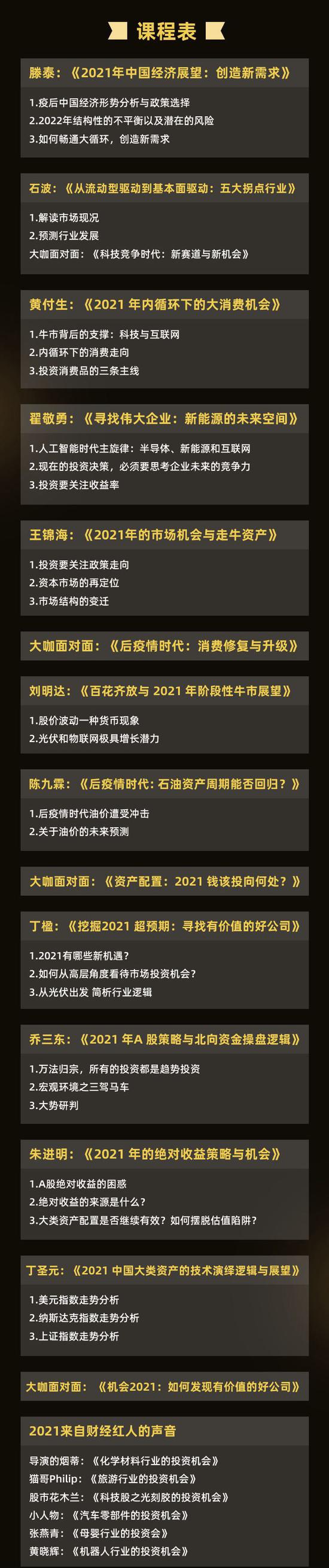想知道明年市场的大势研判?听私募大佬石波带你寻找五大拐点行业的机会;想要知道双循环下怎么布局?听黄付生剖析2021年内循环下的大消费机会;想知道新能源未来的空间还有多大?听翟敬勇讲未来伟大企业在哪里……