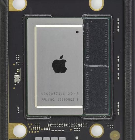M1芯片拆解图,左侧为各部分集成,右侧为2x4 GB的内存