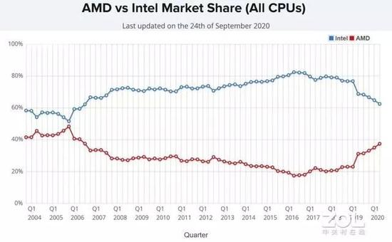 作为intel在传统PC市场最大的,或者说是唯一的竞争对手,长久以来,AMD都在intel的阴影下苟延残喘。在最低谷的2016年,AMD的市场份额已经降至20%以下,而且这些市场份额的来源几乎都是低端处理器。常年处于亏损状态的AMD能够活着,intel对反垄断调查的恐惧功不可没。