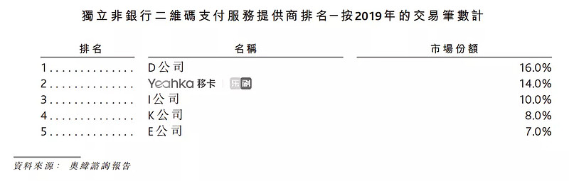 在这一快速增长的细分行业中,按交易笔数统计,排名前五的公司占比为55%,其中移卡以14%的市场份额位列行业第二位。
