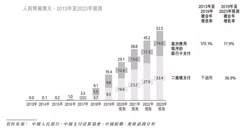未来四年二维码支付将继续保持高速增长,年化复合增长率高达36.9%。市场预计,二维码支付的市场规模在2023年将达到33.4万亿,是基于应用程序的银行卡支付的1.76倍。