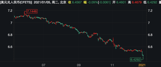 时间拨回2020年6月1日,彼时人民币对美元中间价报7.1315。一个多月后的7月27日,人民币对美元中间价破7,之后8月、9月在6.8-6.9区间震荡,10月21日升至6.6区间,并在11月17日升至6.5左右附近,也是继2018年6月以来重回6.5。如今,不到短短两个月,人民币对美元中间价升至6.4时代。