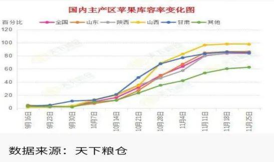 另一角度来看,据天下粮仓公布的库容比数据显示,国内主产区皆有攀升势头,其中山西当前库容率最高基本满库状态持续,其它类似甘肃、山西、陕西等地也都在一个高位水平。这表明当前苹果库存压力仍然较大,价格大概率会受此影响承压运行。
