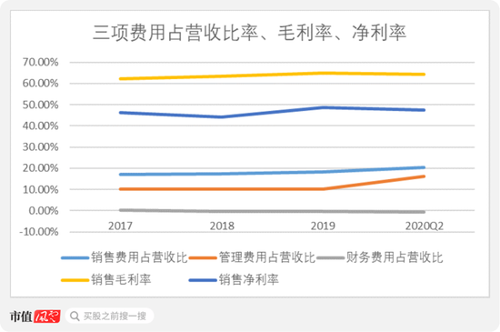 三项费用占营收比率较为稳定,销售费用占比较高,且2020年Q2有上升趋势。