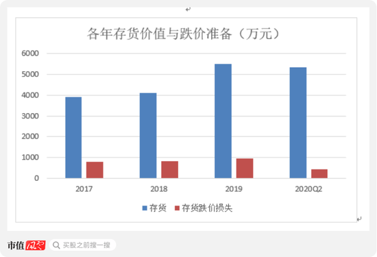 2019年存货由上年的4100万元快速增加至5500万元,2020年Q2就已经达到5300万元,占同期流动资产的39.43%。同时,计提的存货跌价准备也逐年上升,2019年达到967万元。