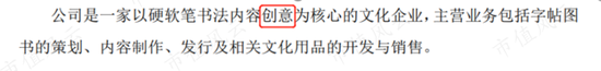 公司对自身的定位是一家“以硬软笔书法内容创意为核心的文化企业”,主业说白了就是卖字帖,还和创意扯上关系了。