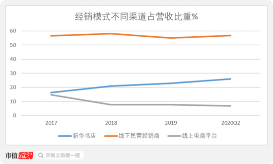 其中,线下民营经销商占近60%,17年以后新华书店的比重逐渐上升,2020年Q2占营收比接近30%,而线上电商平台占比略有下降,2020年Q2占比低于10%。