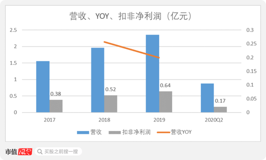 扣非净利润和营收变动趋势一致,2019年扣非净利润为0.64亿元,2020年Q2下降至0.17亿元。