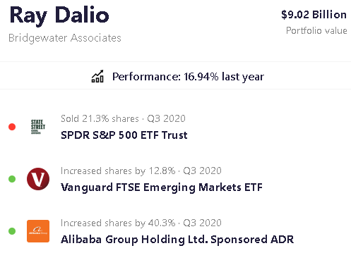 第十二位是Ray Dalio,他是世界上最大的对冲基金公司桥水创始人,号称金融界的乔布斯。2020年基金的回报率为16.94%。Ray Dalio的投资策略与前述的投资者们不同,他将很多资金放置在了ETF中。基金重仓的前十大产品分为以下这两类:ETF:标普500ETF-SPDR、新兴市场ETF-Vanguard FTSE、标普500ETF-iShares、新兴市场ETF-iShares MSCI、新兴市场ETF-iShares Core MSCI、EAFE指数ETF-Vanguard;零售业公司:阿里巴巴、沃尔玛、拼多多,二者分别占比54.7%和12.8%。