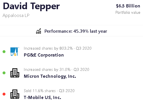第十三位是David Tepper。他是一个是冷门的投资大师,是一个典型的机会主义者,于1993年初创立了对冲基金公司Appaloosa Management。2020年David Tepper的总投资回报率是45.39%。基金重仓的前十大股票主要分为以下这几类:技术服务类公司:脸书、谷歌、推特;日用品公司宝洁;电子科技类公司美光科技;通讯业公司T-Mobile;零售业公司阿里巴巴和亚马逊;消费者服务公司迪士尼;以及金融公司万事达。其中技术服务占总组合比例为25%,日用品和零售业在15%左右,电子科技13.5%,通讯业12.6%。