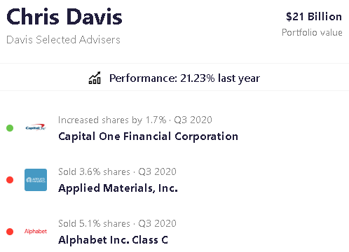 第六位是Chris Davis。他目前是Davis Selected Advisers的投资组合经理,这是一家为高净值客户和风投基金管理资产的家族理财公司,公司主要采用量化方法进行投资。2020年组合的总投资回报率为21.23%。Chris Davis重仓的前十大股票分别为:金融类:第一资本信贷、富国银行、伯克希尔哈撒韦、摩根大通;技术服务类:谷歌、脸书;制造业:应用公司材料、Carrier Global Corp;消费者服务类:新东方。从投资组合的总行业分布看,金融公司占比最大,达40.9%;技术服务类公司占比约为16.6%,制造业、零售业、电子科技公司都在11%左右。