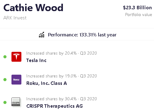 第三位是有女股神之称的Cathie Wood,她所创立的方舟基金一直都有不俗的表现。2020年Cathie Wood的总投资回报率为133.31%。就行业分布来看,技术服务、耐用品行业、医疗科技是她的三大投资行业,这三大行业在她的投资组合中分别占比31.5%、16.3%、29.3%。与此相对应,重仓股票有:耐用品消费的特斯拉,技术服务的Square、Zillow、Slack Technologies、Pure Storage;医疗科技的CRISPR Therapeutics AG、Invitae、Editas Medicine、Intellia Therapeutics。