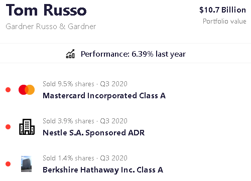 第九位是Tom Russo,他所在的公司Gardner Russo & Gardner Inc.是一家因其保守的长期投资策略而受到富有客户欢迎的投资公司。Tom Russo2020年的总投资回报率为6.39%。两大重仓行业以及对应的重仓公司分别是:非耐用品行业雀巢、保乐力加、荷兰喜力控股、国际烟草公司,总占比42%;金融类公司:万事达、伯克希尔哈撒韦、摩根大通,总占比37.9%。