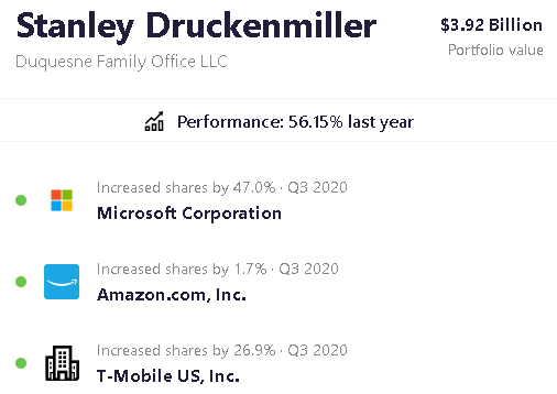 第十六位是Stanley Druckenmiller。他是全球最成功的宏观对冲基金经理之一。从80年代以来他一直是George Soro的得力助手,是“量子基金”的第十位也是最成功的接班人,于1980年开设Duquesne资本管理。2020年组合总投资回报率为56.15%。组合中重仓的三个行业分别是:技术服务、消费者服务和零售业,占比分别是36.0%、19.7%、14.6%。其中技术服务类公司重仓了微软和Sea LTD;消费者服务业公司重仓了佩恩国民博彩和奈飞;零售业公司重仓了亚马逊、星巴克、京东、阿里巴巴。