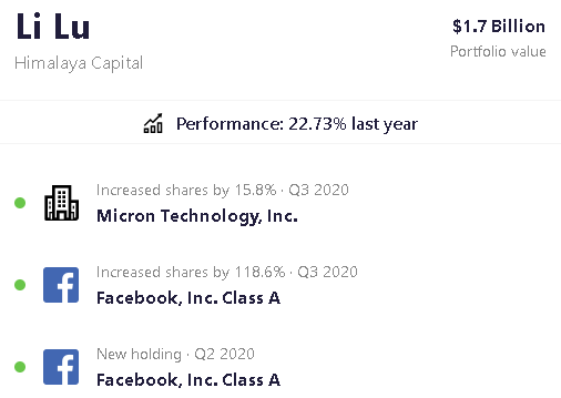 最后一位是一名华人投资者,李录。他于1997底创办了喜马拉雅资本管理公司,旗下管理一只基金Himalaya Capital Investors, L.P.。2020年基金的总投资回报率为22.73%。目前基金总共持有四家公司的股票:电子科技类公司美光科技,占比48.3%;技术服务类公司脸书和谷歌,分别占比21.2%和8.8%;金融类公司美国银行,占比21.7%。
