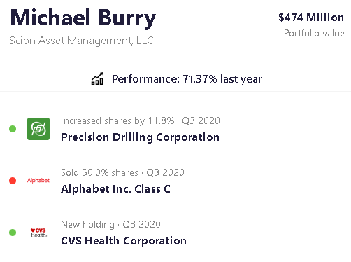 第二位是Michael Burry,所在公司是Scion Asset Management, LLC Holdings。他最著名的事件是2008年做空了房地产市场,这一事件被记录在电影《大空头》(the Big Short)中。2020年Michael Burry的总投资回报率为71.37%。就行业分布来看,他所管理的投资组中零售业、技术服务、金融、工业服务、消费者服务分别占比21.7%、20.4%、16.9%、15.5%、11.8%,投资较为分散。重仓的十大股票分别是精测勘探、谷歌C、西维斯、游戏驿站、脸书、西部数据、高盛、辉瑞、探索频道、麦迪逊花园网络,这些重仓股票所属的行业也主要是前述的占比前五大行业。